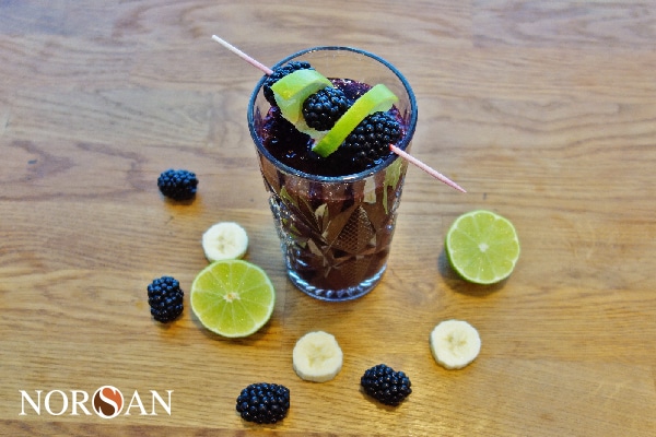 A szedret alaposan megmossuk, és turmixgépbe tesszük. Hámozzuk meg a banánt, vágjuk nagy szeletekre, és szintén tegyük a turmixgépbe. A lime-ot öblítsük le meleg víz alatt, vágjuk félbe, és kézzel facsarjuk bele a turmixgépbe. Adjuk hozzá a hideg vizet. Ezután nagy sebességgel turmixoljuk össze, hogy a bogyókban a magok is összetörjenek. Ha szükséges, adjunk hozzá még egy kis vizet, hogy elérjük a kívánt állagot. Ezután keverjen bele 1 evőkanál Omega-3 Total olajat vagy 1 teáskanál Omega-3 Vegan olajat, és díszítsük szederrel és egy szelet lime-mal.