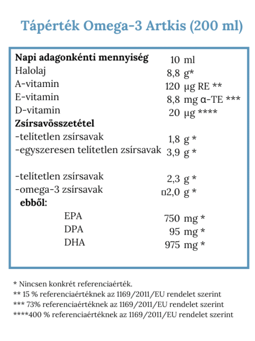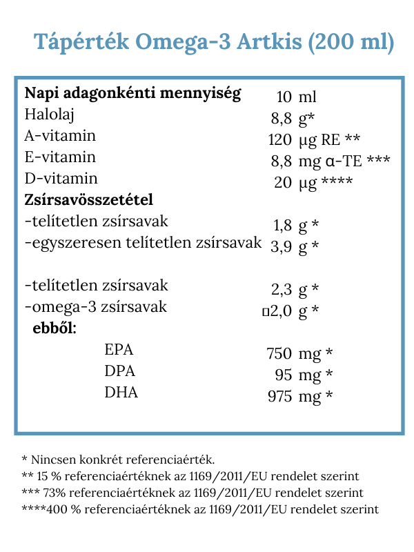 Az Omega-3 Arktis (200 ml) tiszta, természetes tőkehalmájolaj fenntartható sarkvidéki halászatból. Egy napi adag (10 ml, kb. 1 evőkanál) 2.000 mg omega-3 zsírsavat (EPA és DHA) biztosít.