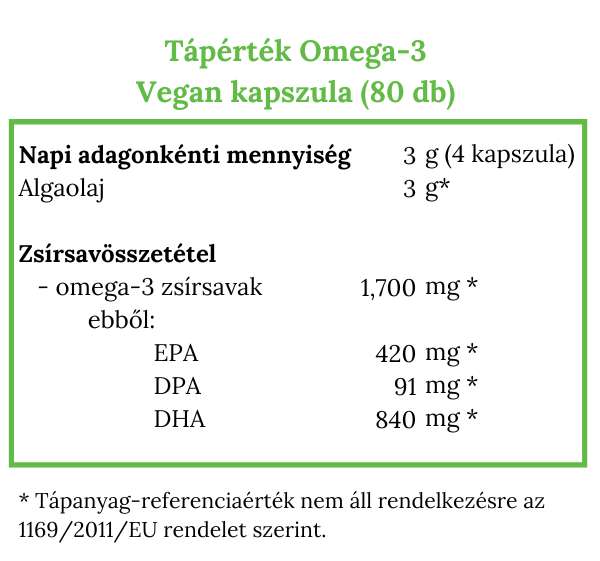 Omega-3 Vegán kapszuláink (80 db) növényi algaolajat tartalmaznak. A mesterséges tengervízben tenyésztett Schizochytrium sp. tengeri mikroalgából kinyert olaj. Ez a mikroalga magas DHA és EPA tartalommal rendelkezik.